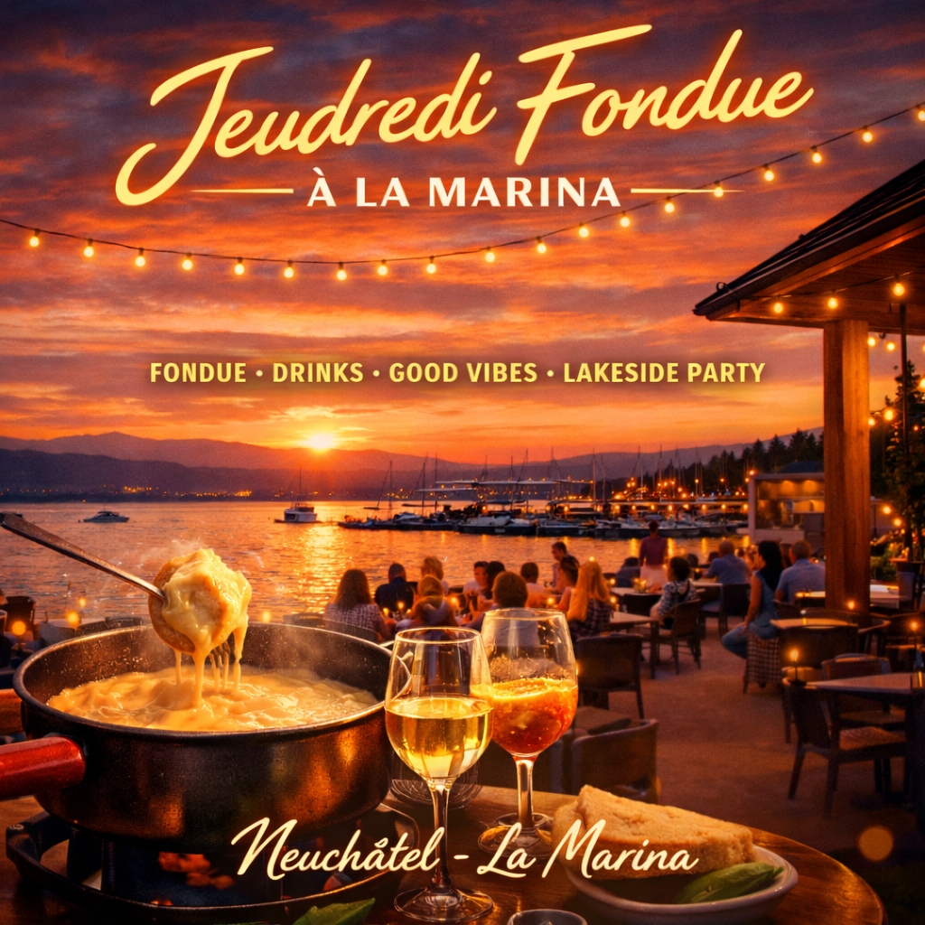 Prépare-toi pour une soirée où la fondue rencontre les bonnes vibes, les verres qui s’enchaînent et une ambiance qui monte doucement au fil de la soirée. Dans le cadre unique de la Marina, au bord du lac, viens profiter d’un moment chaleureux entre potes, entre musique, partage et bonne humeur.